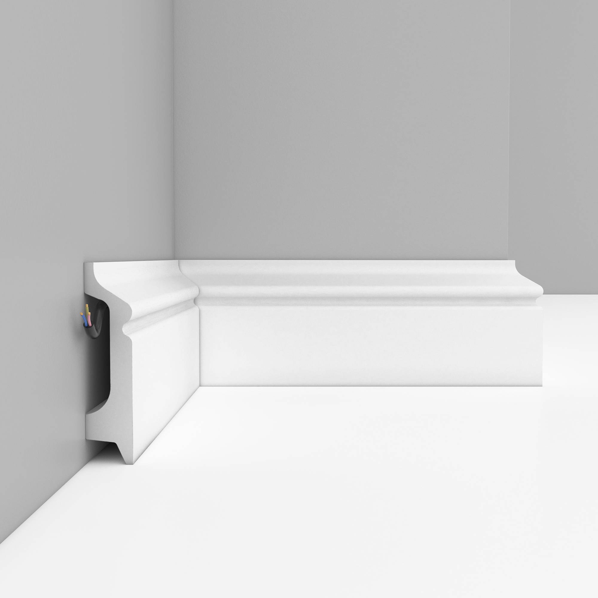 Плинтус D122-115 подходит для квартир, домов, офисов, салонов, шоурумов и других помещений, где важны аккуратное примыкание стены к полу, чистая геометрия, готовое белое покрытие и более высокая стойкость к повседневной эксплуатации.