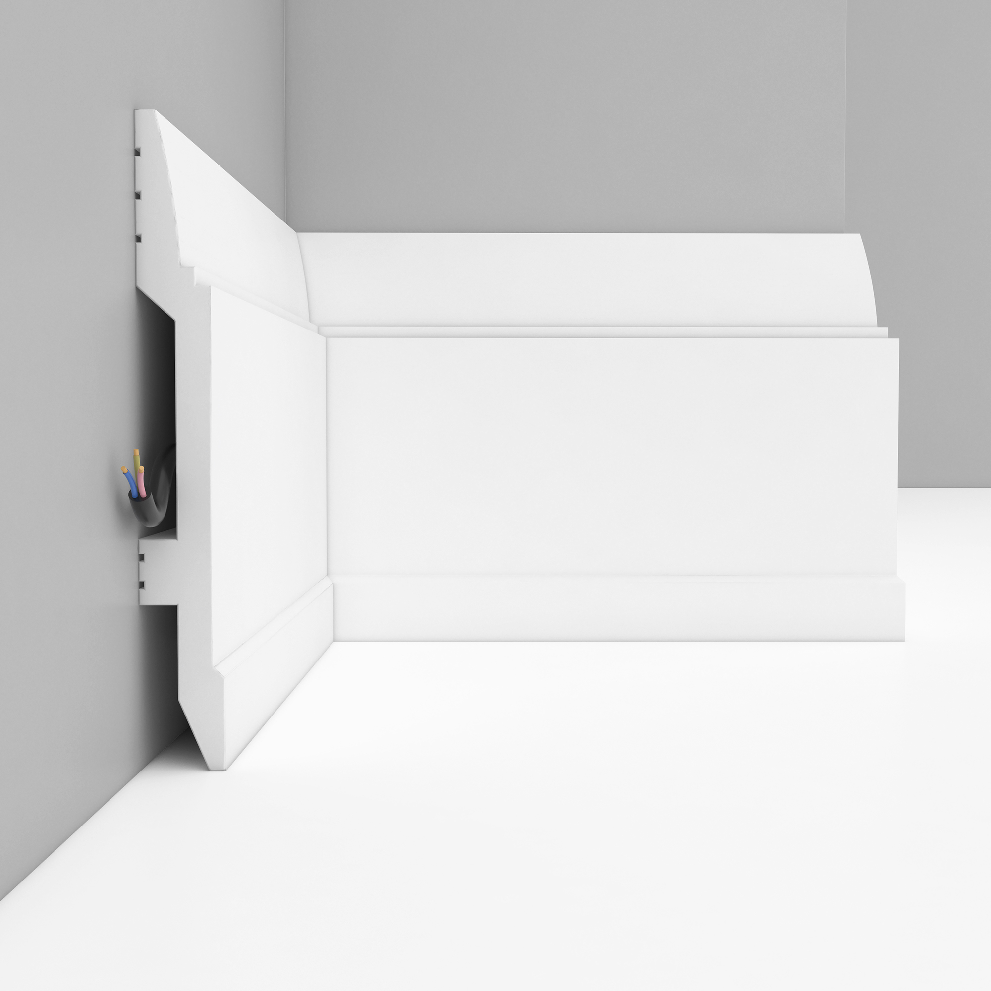Серия D — это дюрополимерные плинтусы под покраску с повышенной ударопрочностью для помещений с более активной эксплуатацией. Такие модели особенно уместны в коридорах, проходных зонах, коммерческих интерьерах и других пространствах, где профиль чаще подвергается задеваниям и бытовым ударам.